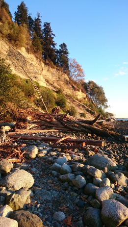 Danach nahm ich den Bus zum UBC-Campus, der wirklich riesig ist und quasi eine eigene Stadt mit Läden, Cafes und Bars. Von dort aus lief ich zum weniger bekannten Tower Beach, auf dem ich so gut wie allein war, denn er ist kein Sandstrand. Weiter ging es einen Weg entlang, der den Tower Beach mit dem daneben liegenden Wreck Beach verbindet und dabei abwechselnd am Strand entlang und durch den Wald führt. Auf dem Weg konnte ich dann, um diesen tollen Tag abzurunden, noch einen wunderschönen Sonnenuntergang genießen und in das entspannte Studentenleben hineinschnuppern, die am Wreck Beach regelmäßig Lagerfeuer veranstalten.
